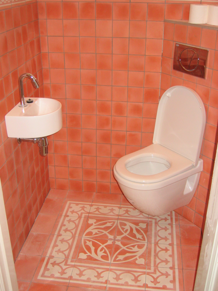 Castelo-wc compleet betegeld met Castelo cementtegels en afgemonteerd in Harense 30er jaren villa.